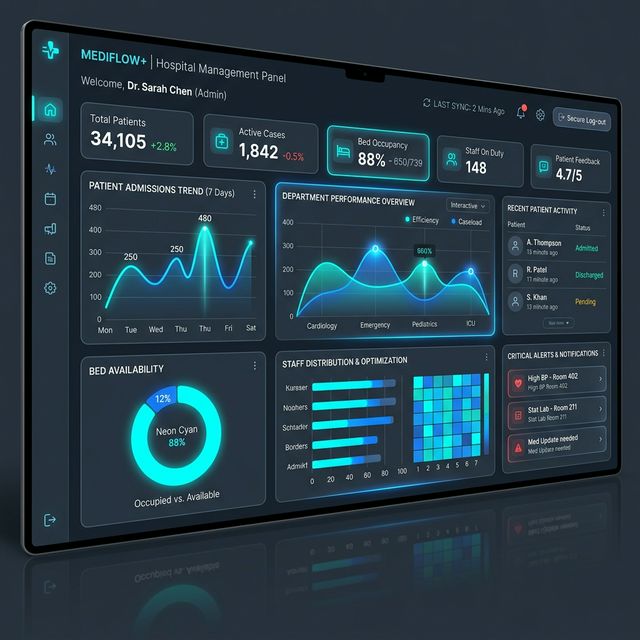 Hastaneler için bulut tabanlı, yüksek güvenlikli ve uçtan uca veri yönetimi sağlayan yönetim paneli.